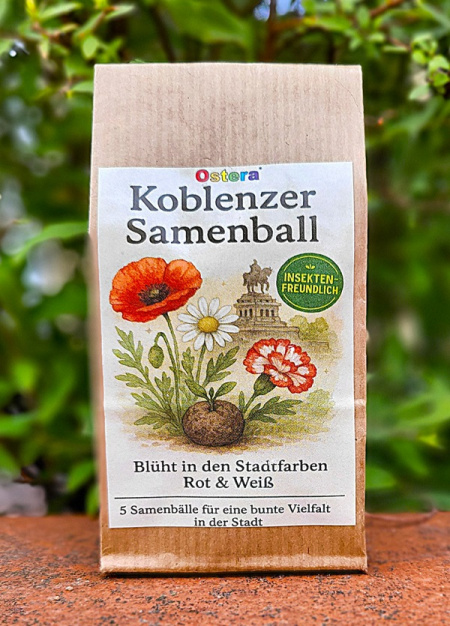 Der Koblenzer Samenball ist eine speziell zusammengestellte Blumenmischung im praktischen Seedball-Format für urbane Flächen. Blüht in Rot & Weiß – passend zu den Stadtfarben.