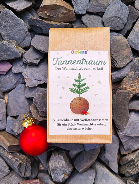 Mit dem „Tannentraum“ bringst Du Natur und Festlichkeit zusammen: 5 handgemachte Samenbälle mit Samen der Weißtannen. Ideal als Geschenk oder kleine Aufmerksamkeit in der Adventszeit – und ein nachhaltiger Kontrapunkt zu klassischen Weihnachtsartikeln.